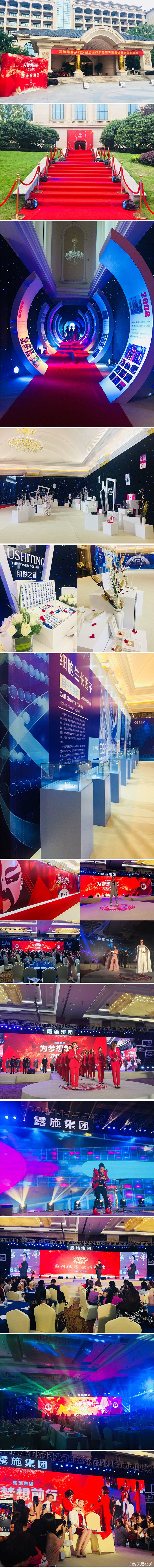 現場布置溫馨高端大氣,外場布置嚴謹,星光大道紅地毯一路走來,都在歡迎露施的每一位家人,星空幕布更營造一種唯美感覺,企業品牌團隊展示讓嘉賓找到自己的歸屬感,更讓人深刻記憶的是每一款產品的都很精致的陳列著,舞臺舞美的構造更是讓現場環節得到更大的發揮利用空間。