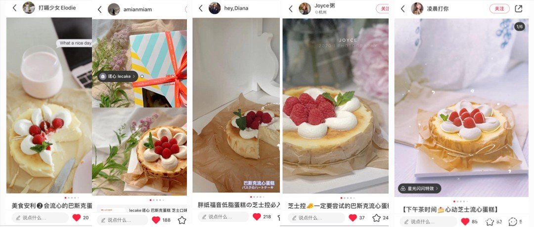 以諾心的巴斯克蛋糕為例,通過素人營銷模式,在小紅書芝士控、流心蛋糕、巴斯克蛋糕廣場上均有露出,無論是圖片還是文案,都是高質量且通過素人實際品嘗有感而發的內容,這樣的內容更加真實值得信任,更容易幫助消費者種草。