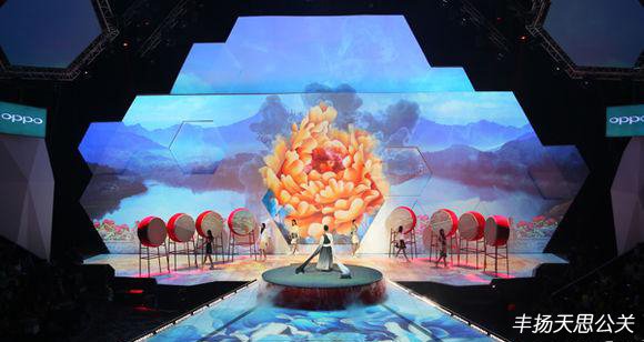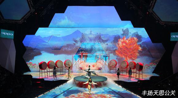 在背景舞美多媒體視覺設(shè)計(jì)上,以盛放的牡丹、古雅的拱橋與湖心的亭臺(tái)作為主要元素,配合大鼓道具、干冰,讓舞臺(tái)呈現(xiàn)一個(gè)唯美的意境